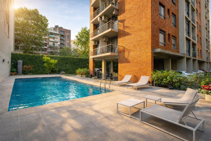 Departamento de dos ambientes con balcón y cochera ubicado en el cuarto piso de un edificio en torre. Ingreso al living con sali...